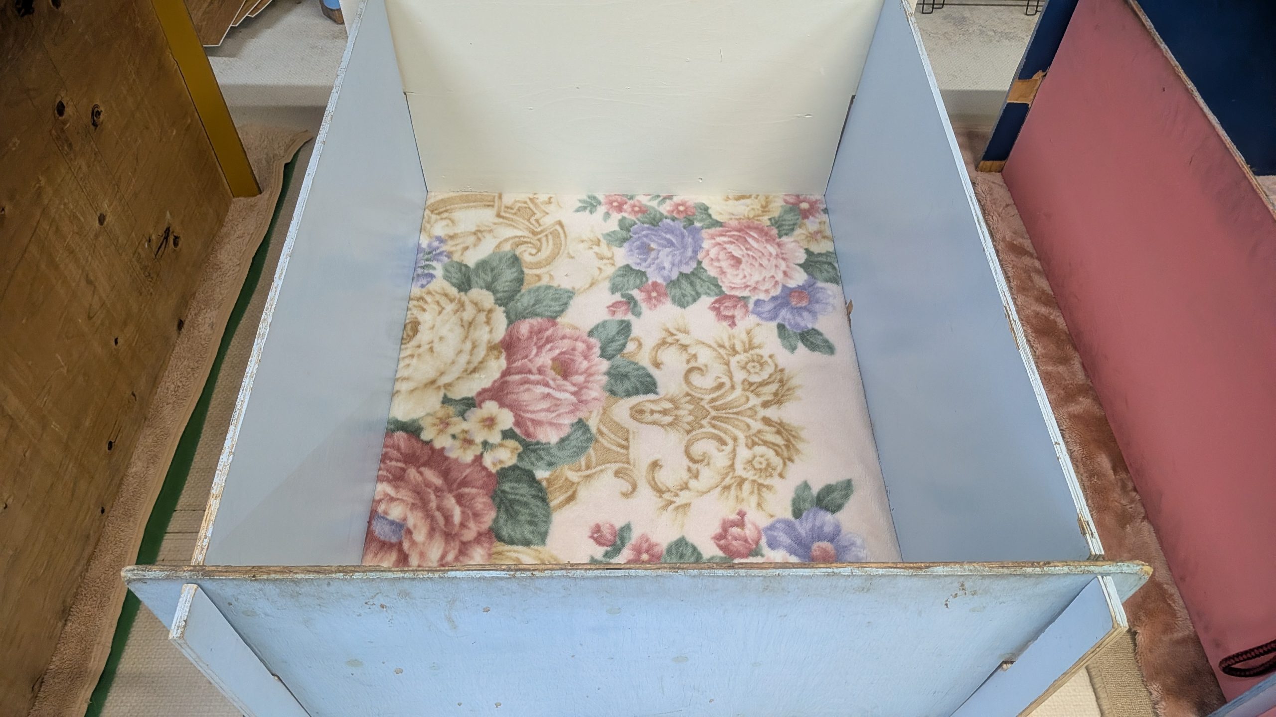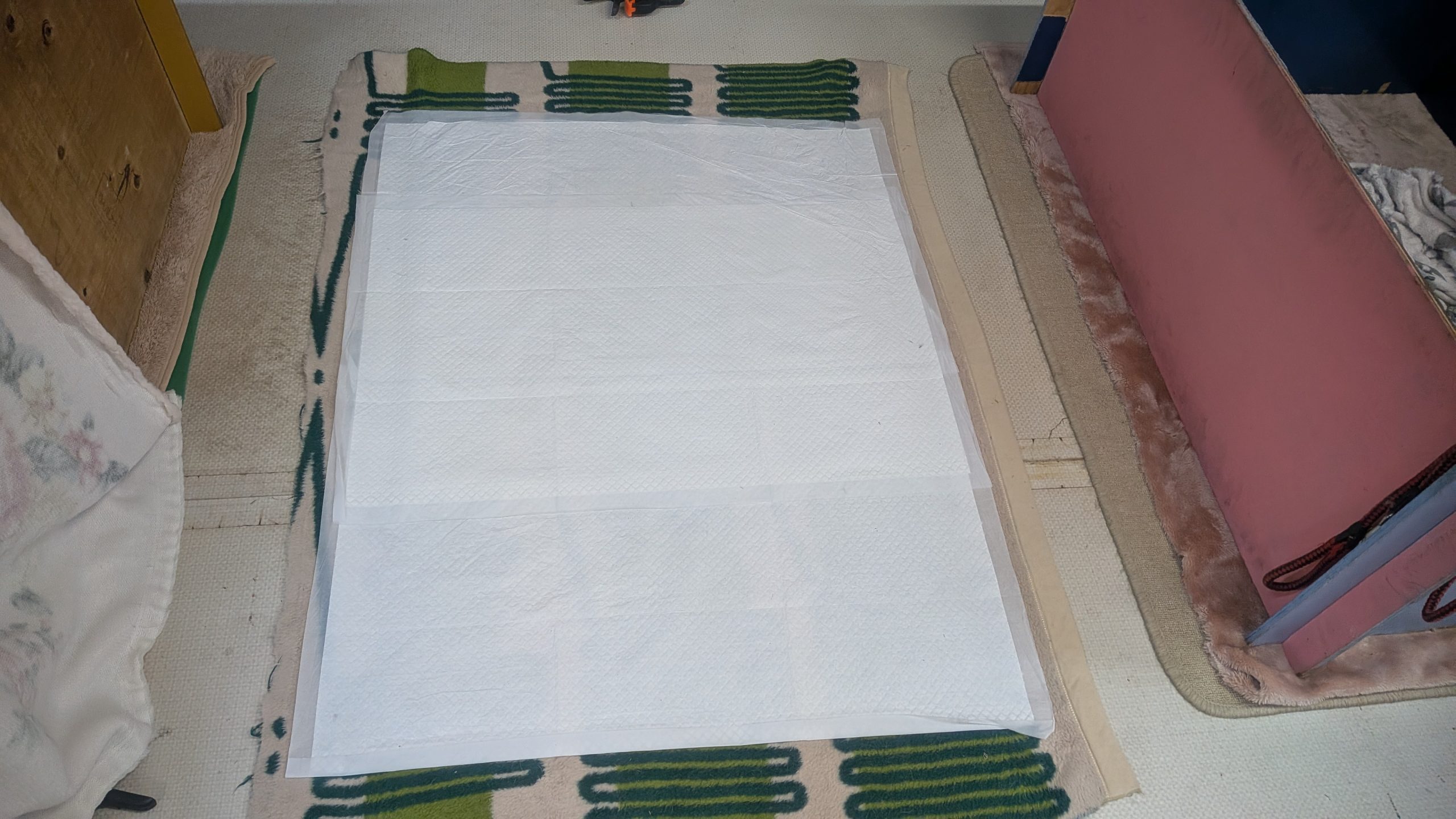 下にトイレシートを敷いて、その上に毛布をかぶせることで、足が滑らないようにしてあります