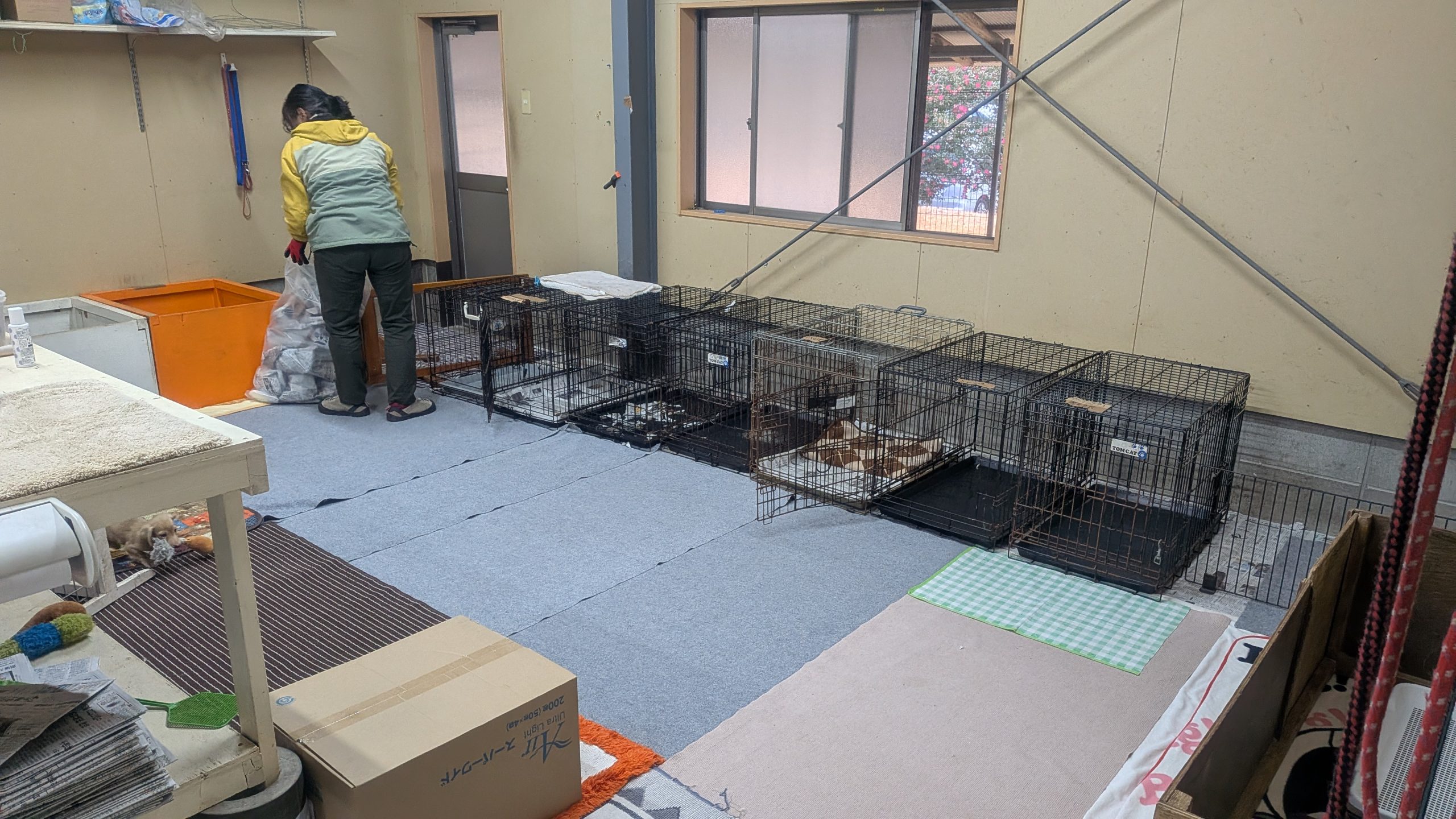 介護のお部屋、元気な子たちの部屋、それぞれ手分けして掃除します。